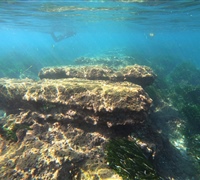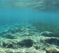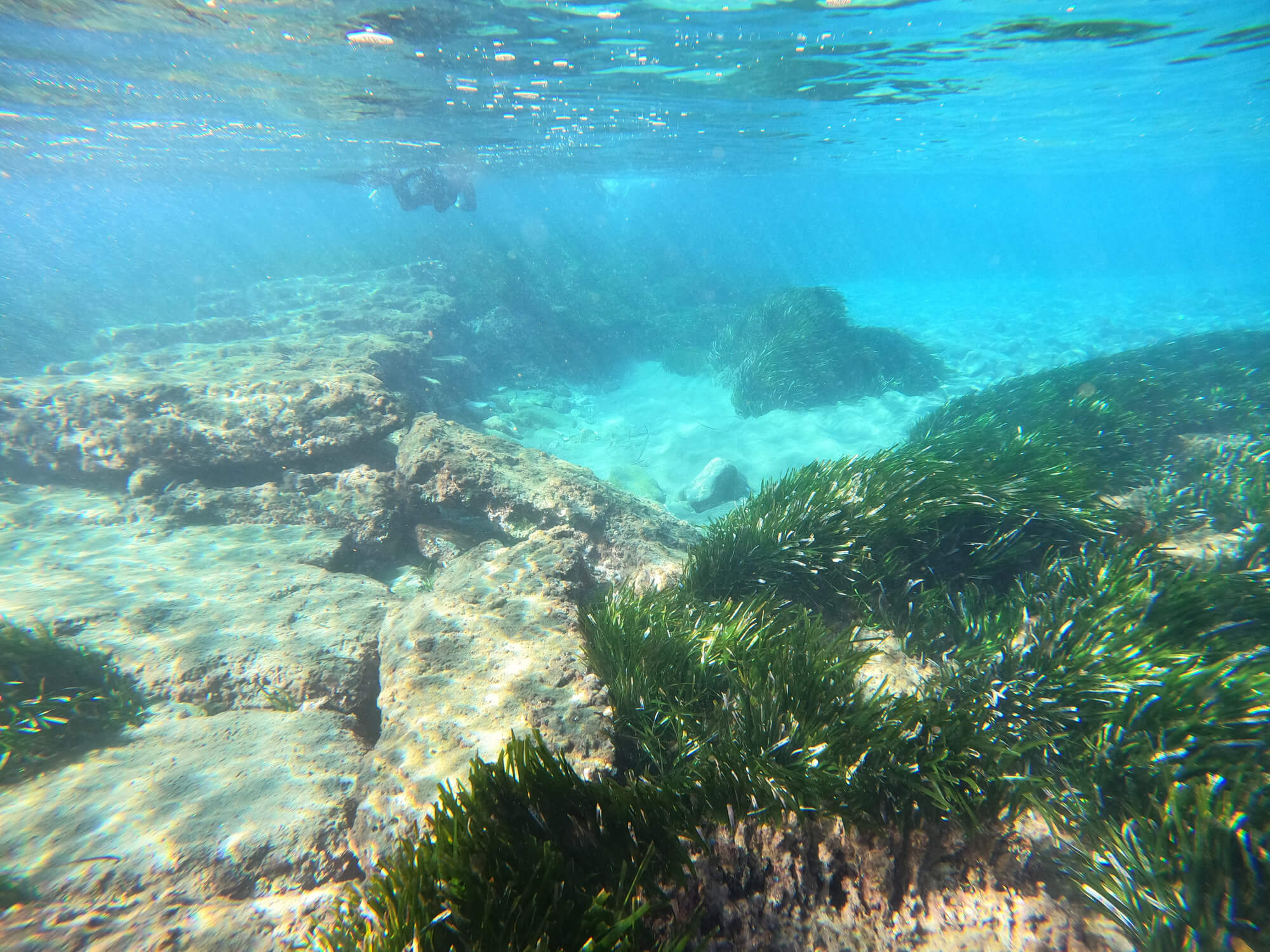 Ακολουθούμε δυτική πορεία για περίπου 170 μέτρα σε βάθος 1,5 μέτρων, όπου κολυμπάμε πάνω από λιβάδια Ποσειδωνίας και πάνω από τον νότιο λιμενοβραχίονα. Η εκπληκτική ορατότητα σε αυτή την τοποθεσία μας επιτρέπει να θαυμάσουμε και να εκτιμήσουμε πραγματικά τη βιοποικιλότητα της περιοχής. Σε αυτό το σημείο κάνουμε στροφή 360 μοιρών για να αντιμετωπίσουμε το αρχαίο λιμάνι της Αμαθούντας.