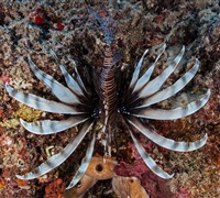 The biodiversity on the wreck is rich, with colourful sponges growing on the wings and hull. Lionfish lazily live in various locations on the wreck and around the reefs, while a snorkel shelters under a wing.